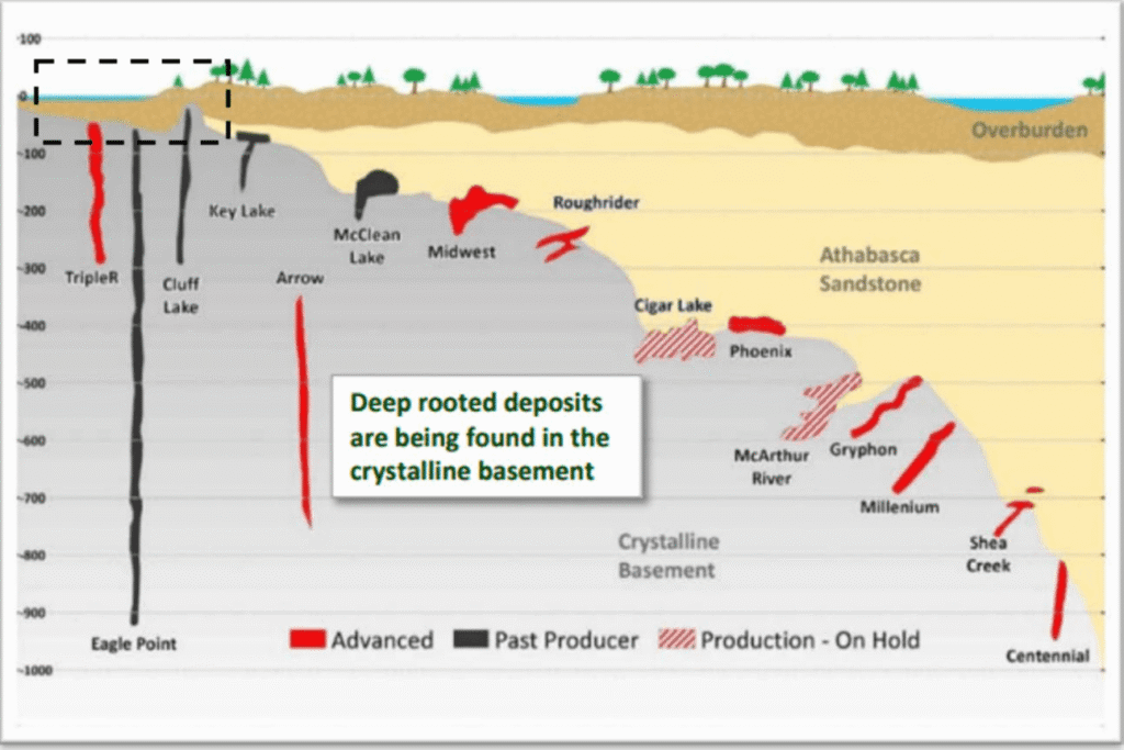 In Saskatchewan, uranium deposits have been discovered at, above and up to 300 metres below the Athabasca group unconformity within basement rocks. Mineralization can occur hundreds of metres into the basement or can be up to 100 metres above in Athabasca group sandstone. Typically, uranium is present as uraninite/pitchblende that occurs as veins and semi-massive to massive replacement bodies. Mineralization is also spatially associated with steeply dipping, graphitic basement structures and may have been remobilized during successive structural reactivation events. Such structures can be important fluid pathways as well as structural or chemical traps for mineralization as reactivation events have likely introduced further uranium into mineralized zones and provided a means for remobilization (Jefferson, et al. 2007) (Figure 2).
