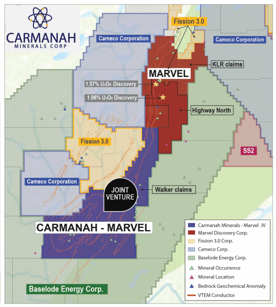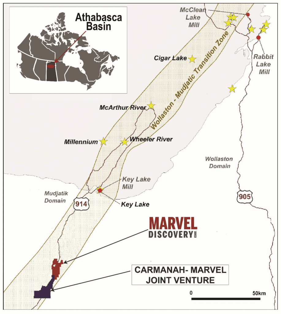 “We are very excited to have reached an agreement with Marvel Discovery on this project, it is ideally situated along the Key Lake fault which is home to some of the highest-grade Uranium in the world. The project is also directly tied on to Fission and Cameco’s ground which runs along the Key Lake Shear Zone and hosts 10 Uranium showings and multiple EM Targets. This corridor represents a tremendous opportunity in mimicking the success of basement-hosted uranium deposits found on the western side of the Athabasca Basin like NexGen Energy’s Arrow Deposit. Marvel has done a remarkable job advancing the project and we look forward to working with our new partner with the goal of a Tier 1 Discovery,” stated Latika Prasad, Chief Executive Officer of the Company.”
