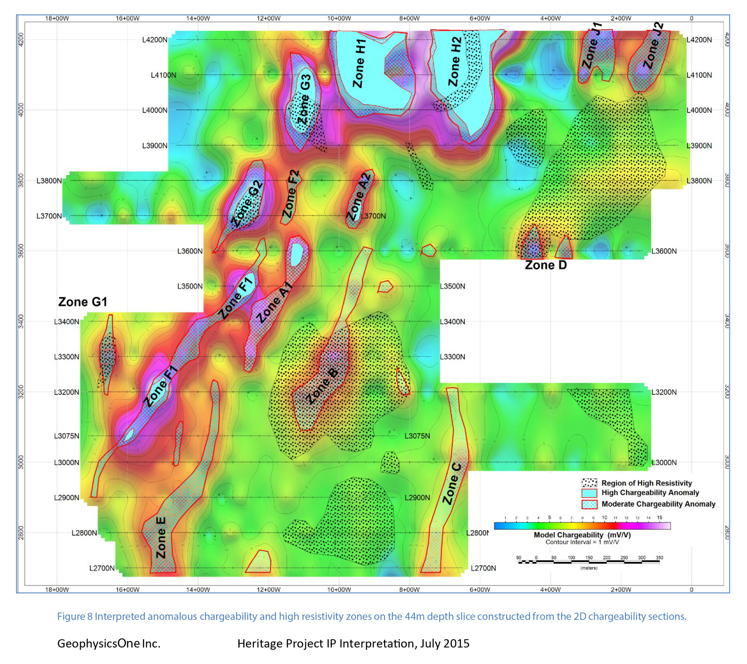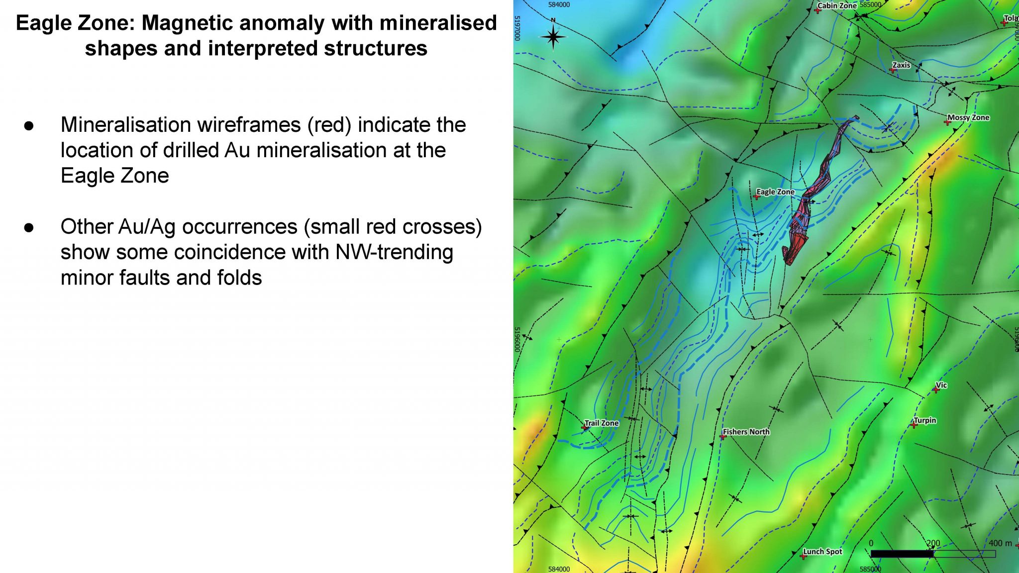 The Eagle Zone represents the most advanced area of the project, where drilling and geophysics define a coherent mineralized corridor. Historical work outlines approximately 1.08 million tonnes grading 2.19 g/t AuEq.