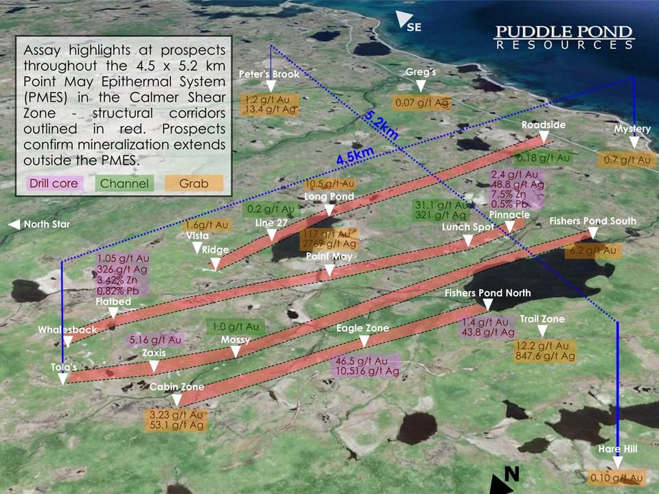 The Skull Island Project covers approximately 145 km² and consists of 580 mineral claims within the Avalonian Epithermal Belt. This geological setting is known for hosting gold-silver systems, including the past-producing Hope Brook gold mine.